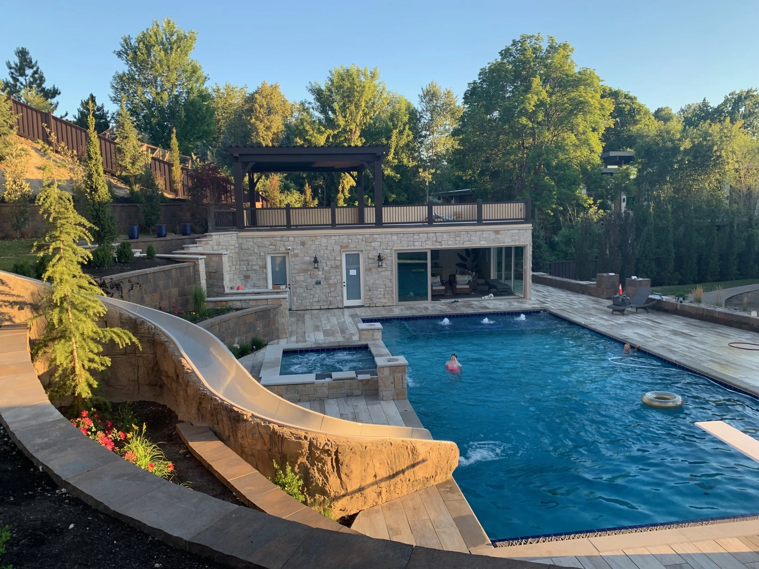 Backyard view of a luxurious outdoor pool area with a water slide, stone patio, and a stone building. Surrounded by trees and shrubs, with a clear blue sky overhead.